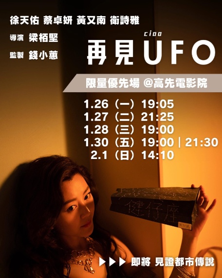 高先發行、錢小蕙監製、梁栢堅執導,徐天佑、蔡卓妍、黃又南與衛詩雅主演的《再見UFO》雖然至今未正式公映映期,但自去年年底開始便不斷推出限量優先場,並且場場爆滿,足見觀眾對於這部都市傳說電影的期待與支持,而高先發行亦為此不斷加開場次。
