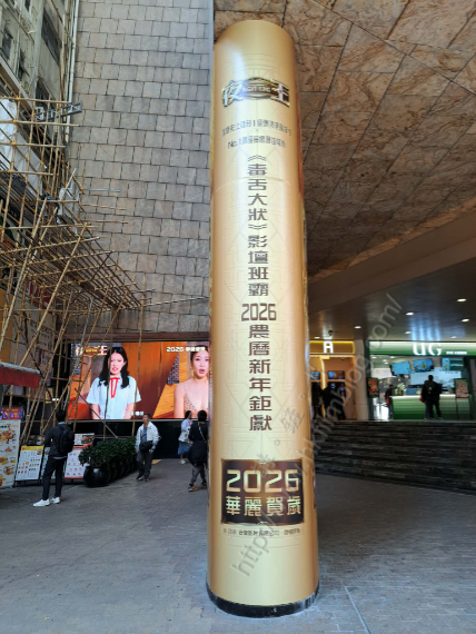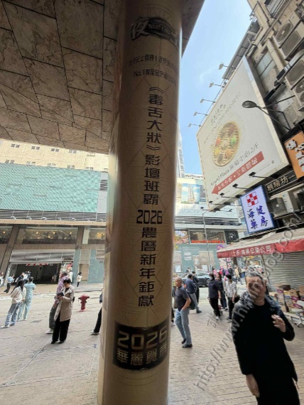 先來看看左方的柱位,向著馬路的一方寫上「《毒舌大狀》影壇班霸2026農曆新年鉅獻」的字樣。