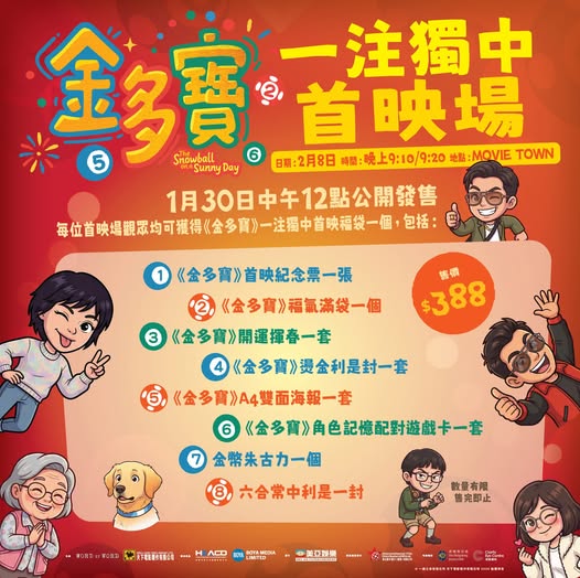 《金多寶》一注獨中首映場將於今天中午場經由Movie Town票房、MCL院線網站及手機應用程式發售。有意先睹為快的觀眾,敬請把握機會按時購票好了。
