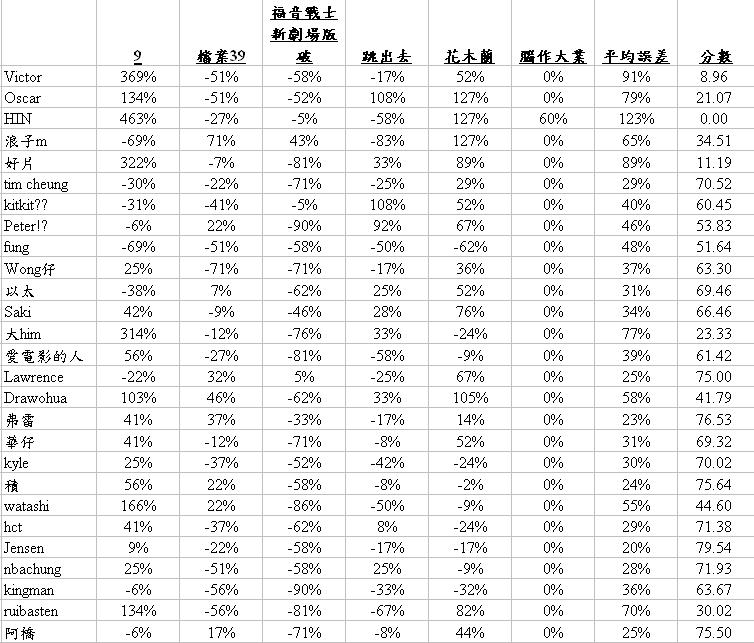 是次需要預測的六部電影當中,除了《腦作大業》不入十大外,其實五片都在十大之列。在計算各參賽者的誤差值後,結果如下: