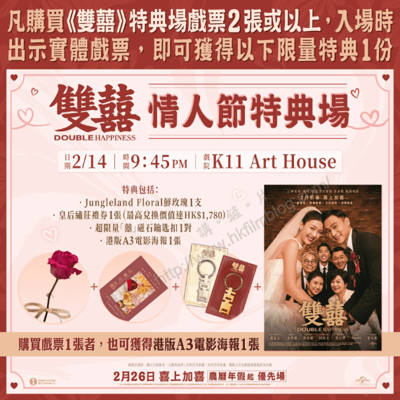 環球發行、台灣導演許承傑執導,劉冠廷、余香凝、楊貴媚、田啟文、庹宗華、9m88與蔡凡熙主演的婚禮題材喜劇《雙囍》將於二月二十六日在港上映,並且於農曆新年期間推出優先場。然而電影將安排於二月十四日星期六晚上九時四十五分假尖東站K11 Art House舉行情人節特典場。而觀眾在購買戲票並於入場時出示實體戲票,則可按戲票數量獲發對應特典。