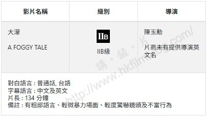 翻查負責電影檢查的電影、報刊及物品管理辦事處的紀錄,《大濛》於上月完成電影檢查,對白語言為普通話與台語、字幕語言為中文及英文、片名134分鐘,並因有粗鄙語言、輕微暴力場面、輕度驚嚇鏡頭及不當行為而被評為青少年與兒童不宜的II B級別。