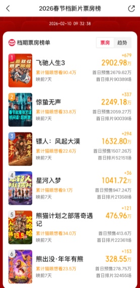 雖然《飛馳人生3》與《驚蟄無聲》場次相若,但是經過約一天預售後,《飛馳人生3》預售達2,903萬,較《驚蟄無聲》的2,249萬多逾600萬,看來也許跟其系列電影有一定的觀眾基礎。而《鏢人:風起大模》在場次約為前述兩片的五成半,首天預售票房約1,633萬,預售成績其實比例上不算太差,但是近年賀歲古裝電影出現疲態,實際仍需看其水準。