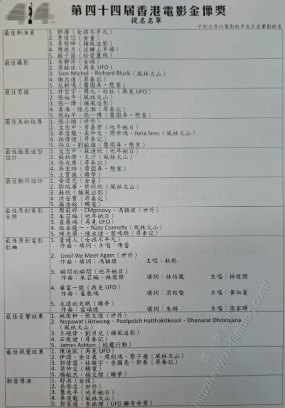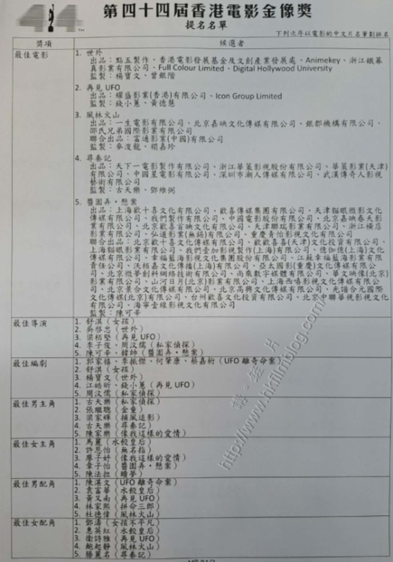 第四十四屆香港電影金像獎已於今天下午舉行記者招待會,在公佈各項相關頒獎典禮事宜之餘,亦同時公佈了十八個獎項的入圍名單。