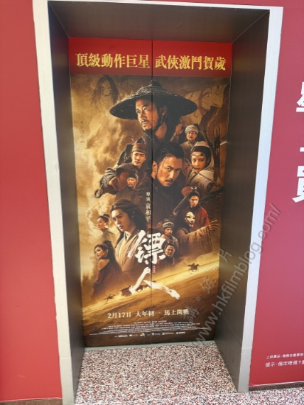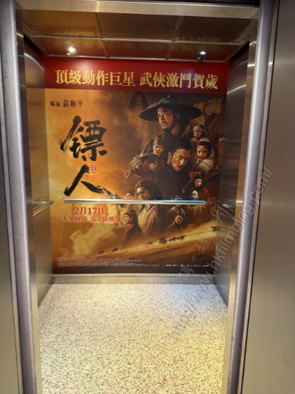 上圖所見,便是「講。鏟。片」情報人員於上周末在鑽石山荷里活廣場CineArt Hollywood影藝戲院所攝,可以看到連接下層戲院大堂至上層戲院的兩部升降機機門 均貼上了電影《鏢人:風起大漠》的宣傳。