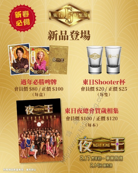 先是「過年必勝啤牌」,每盒正價100元,而會員價則為80元。第二款則是「東日Shooter杯」,每杯正價為120元,而會員價則是100元,最後就是「東日夜總會賀歲相集」,每本正價為120元,而會員價則只需100元,未知道大家對這三款《夜王》周邊產品,又有多少興趣購買呢?