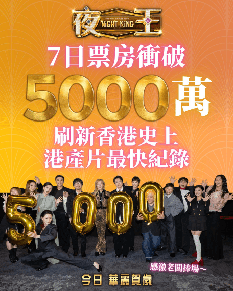 據安樂影片與電影《夜王》在其官方Facebook的資料顯示,電影《夜王》在今天上映第七天截止下午六時為止,其電影於港澳地區的累積票房已衝破五千萬大關,並指已刷新香港史上港產片最快達至五千萬的票房成績。而電影於農曆新年期間,觀乎現場入座情況,明顯在入場上亦相當佔優。