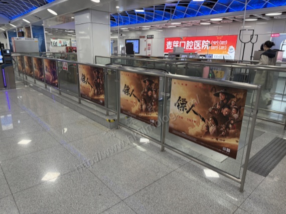 上圖所見,便是「講。鏟。片」情報人員於農曆新年期間於深圳地鐵2號線與12號線的轉車站海上世界站所攝,可以看到其車站部分欄杆的玻璃,已披上了電影《鏢人:風起大漠》的宣傳。