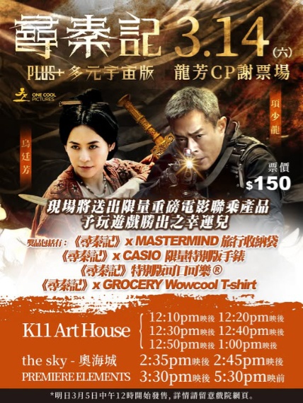 而《尋秦記》於三月十四日星期六,特別安排了十場古天樂與宣萱的謝票場次,當中更會於現場送出限量電影聯乘產品予玩遊戲勝出的幸運兒。十場的場次包括六場於尖東站K11 Art House、兩場奧海城The Sky及兩場九龍站Premiere Elements場次,票價承惠150元,並且於今天中午起開始發售。觀乎這類型的場次,也是希望可以催谷一下《尋秦記》,希望最終可以破億落畫。