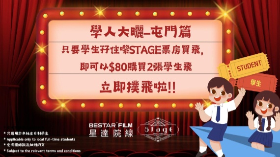 上圖所見,便是星達院線在其官方Facebook的通告,觀眾於平日星期一至五親臨位於屯門市廣場一期StagE戲院票房購買兩張學生戲票,兩張戲票只是八十大元,平均每票亦只需四十元。當然,這個優惠需要連續購買雙數數目的學生戲票方可享有優惠,而星期六、日及公眾假期並不適用,而入場時亦需要出示學生證以證明學生身份。
