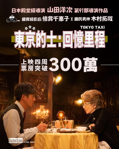 上圖所見,便是高先發行、山田洋次執導,倍償千惠子與木村拓哉主演的日本電影《東京的士:回憶里程》於二月五日在香港上映。雖然電影遇上農曆新年的電影開畫影響,自農曆新年開始上映場次不算太多,但是憑著電影本身的口碑,保持著一定的入座率。