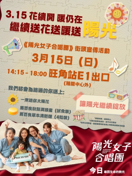 上圖所見,便是電影《陽光女子合唱團》的街頭宣傳詳情。電影將於今天三月十五日下午二時十五分至六時期間,在港鐵旺角站E1出品雅蘭中心外舉行街頭宣傳活動。活動將為觀眾提供迷你太陽花、試食裝秋梨潤喉蜜與四粒裝草本清熱糖。