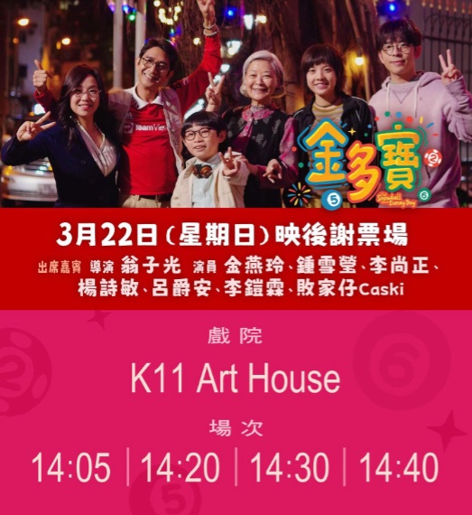 上述四場的《金多寶》謝票場戲票,將於今天中午十二時開始在K11 Art House票房、MCL院線網站及手機應用程式發售。有意購買的觀眾,就要把握機會好了。