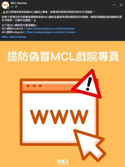 上圖所見,便是MCL院線在今天下午的截圖,而近年有發現疑似冒MCL院線的專頁,並強調該專頁所發佈的資訊與MCL戲院無關。而貼文更特別提供了關於MCL院線在Facebook與Instgram的專頁位置,並提醒觀眾如發現可疑網站的話,可以截圖交予有關院線來作出跟進。
