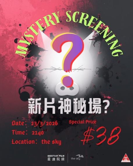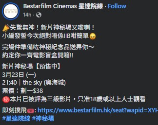 上圖所見,便是星達院線推出的新片神秘場,神秘場安排於三月二十三日星期一晚上九時四十分假奧海城The Sky放映,而票價則只需三十八元。值得注意的是,圖片的右下角有一個三級標誌,意味著放映電影已被評為三級,只准年滿十八歲人士觀看。