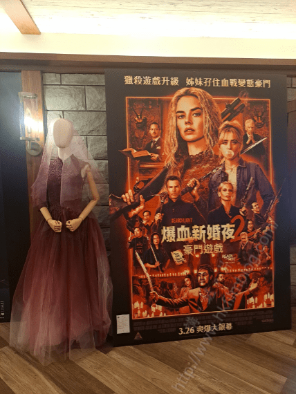 當中右方的宣傳紙板也許是熟口熟面,但是最為特別的,就是在宣傳紙板的左方,擺放了一個假人模型,而假人模型則披上了婚紗,而婚紗的色調也令人聯想起婚紗染血的狀況,明顯地是配合了這彈部電影的主題而設。未知大家又怎去看這個電影的宣傳呢?