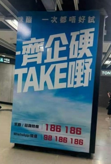 事件的起因,就是保安局禁毒處為了宣揚新一輪的禁毒運動,除了起用了藝人郭富城來作宣傳外,更在港鐵車站展示「一齊企硬唔Take嘢」的廣告。可是這個廣告其實用上了方型柱位的兩側,而在字款編排之下,結果出現了「齊企硬Take嘢」令人感到啼笑皆非的展現方式。