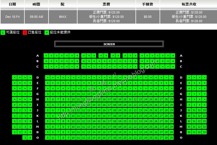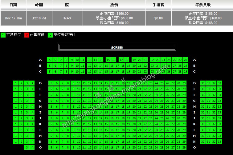 在開售的同時,大家也可以看到UA iSquare IMAX影院的座位表,相比起Megabox而言,該影院可算是較為「四正」,一行共設座位33個,左、右兩則各有四個座位,中間一排則有廿五個,共設有十五行,全院共設座位464位,較現時Megabox IMAX影院座位數目多出接近一倍。