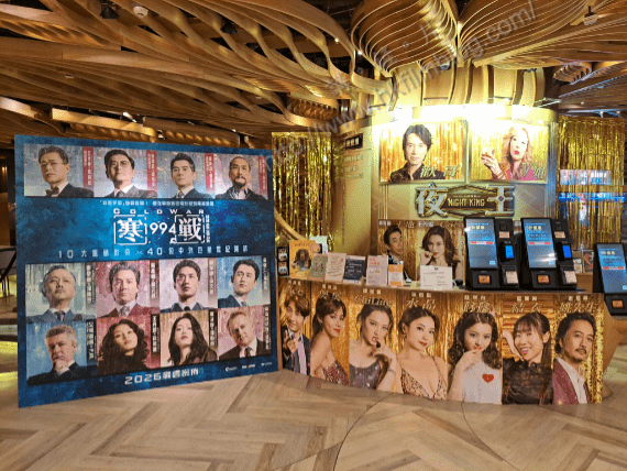 上圖所見,便是「講。鏟。片」情報人員日前於金鐘太古廣場MOViE MOViE Pacific Place所攝,可以看到該處的大堂將兩部電影的宣傳放在一起。左方就是早前安樂影片發佈由梁樂民執導兼編劇的《寒戰1994》,以十二位演員的大頭照作主打。至於右方則是安樂出品兼發行、吳煒倫執導兼編劇的賀歲片《夜王》,當中以十三位演員的大頭照作主打。