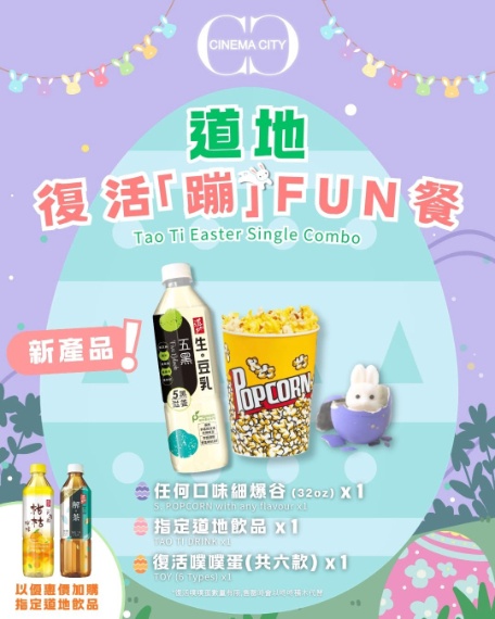上圖所見,便是來自擁有兩間戲院的Cinema City官方網站截圖,可以看到該戲院推出了「道地復活『蹦」Fun餐」,套餐包括了任何口味的三十二安士爆谷一客、指定道地飲品一樽及復活噗噗蛋一隻。當中飲品方面,則主打生豆乳。而套餐亦可以用優惠價來加購指定道地飲品。