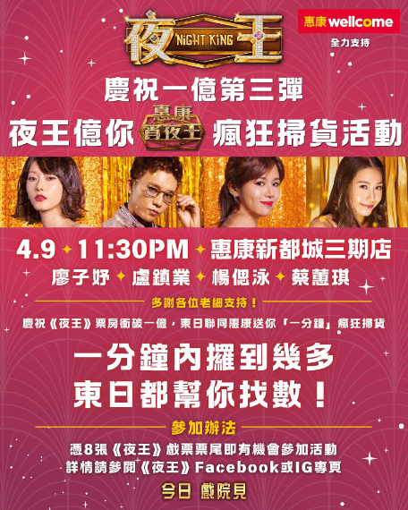 安樂出品兼發行、吳煒倫執導兼編劇,黃子華、鄭秀文、王丹妮、廖子妤、楊偉倫、謝君豪與盧鎮業主演的夜總會題材電影《夜王》票房找億後,安樂發行仍於本月繼續展開宣傳活動。而今天更提人供了兩個宣傳。