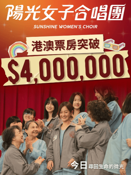 上圖所見,便是壹叁喜喜在港發行、林孝謙執導,陳意涵、翁倩玉與鍾欣凌主演的溫情電影《陽光女子合唱團》,電影在台灣錄得破本土電影的七億半新台幣成績。至於香港方面,電影自一月下旬開始口碑優先場,並且在多度優先場後,於三月五日正式上映。