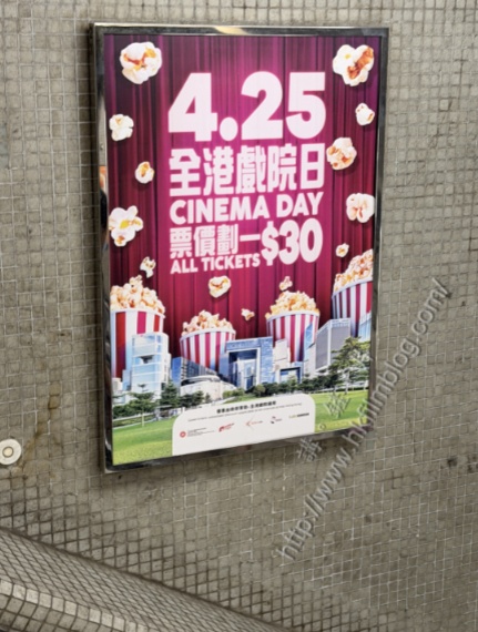 上圖所見,便是「講。鏟。片」情報人員於其中一個港鐵車站出口的扶手電梯所攝,可以看到在扶手電梯的廣告,已披上今年的全港戲院日宣傳,而宣傳下方以政府總部「門常開」與添馬公園為主體,同時配一了四杯爆谷及十數粒爆谷,當中標榜在全港戲院日票價劃一為三十元。