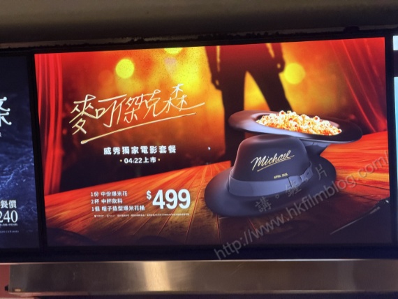 環球發行的《米高積遜》於今天在港正式上映,而電影在台灣亦是同期上映。而上圖所見則是「講。鏟。片」台灣讀者提供的圖片,攝於台北市信義區的信義威秀影城的小食部所攝,可以看到台灣的威秀影城因應電影《米高積遜》(台譯:麥可傑克森)而推出了相關的電影套餐。