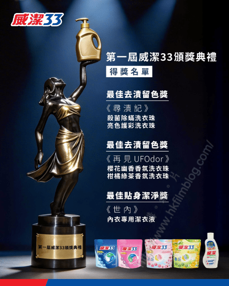 上圖所見,便是洗衣品牌「威潔33」的最新廣告,當中出現了「第一屆威潔33頒獎典禮」,而獎項就仿如金像獎女神的設計,當中沒有了金像獎的菲林服飾,而拿起的卻是一支洗衣液。而下方也寫上了獎項名稱,也算是做到似模似樣。