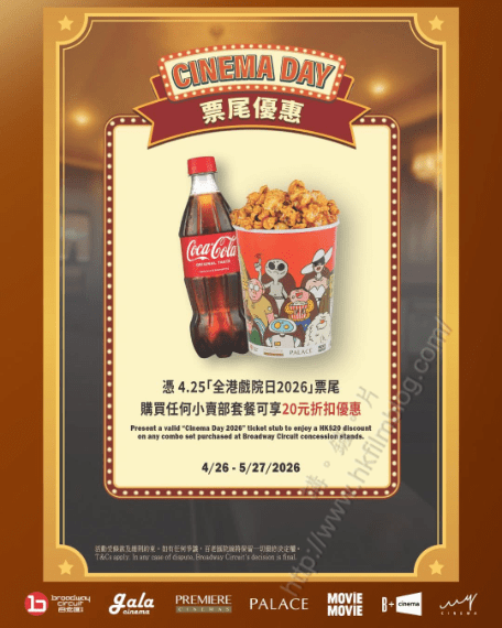 上圖所見,便是來自百老匯院線的截圖,可以看到該戲院為今年的全港戲院日提供票尾優惠,觀眾憑著今天在百老匯院線的「全港戲院2026」的票尾,於四月二十六日五月二十七日期間,在百老匯院線旗下戲院的小賣部購買任何小賣部套餐,就可以享有二十元的折扣優惠。當然,這類優惠受條款及細則所約束。