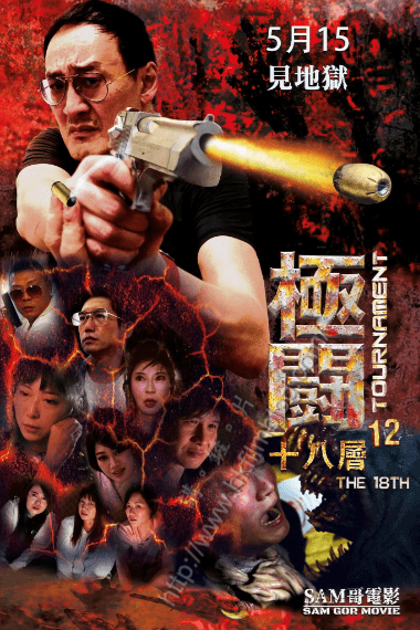 上圖所見,便是電影《極闘12十八層》的新版電影海報,海報可以看到以紅色作為背景,而上方看到男主角、監製、導演與編劇的Sam哥手持著槍的招牌姿勢,並且看到有子彈射上的火光,而下方則看到片袙勾一眾人物,當中最明顯看到近幾集的主角之一的金光。而上方寫上「5月15見地獄」確定映期。