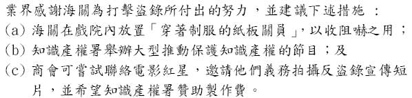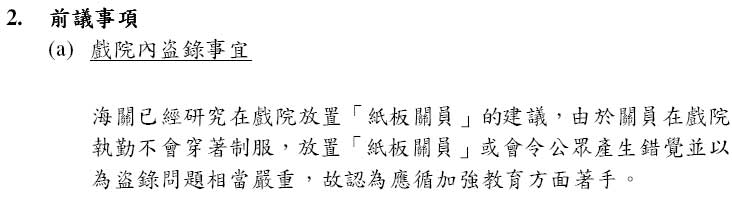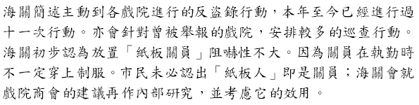 翻查香港政府與戲院商營商聯絡小組的會議紀錄,於去年四月的第八次會議中,戲院業界曾提議海關在戲院放置「穿著制的紙板關員」,以收阻嚇之用。