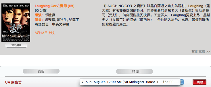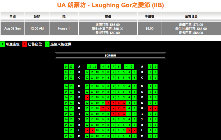 星期四8月6日上午十點到過UA官網看《Laughing Gor之變節》午夜場的售票情況,只有廿三位觀眾購票。