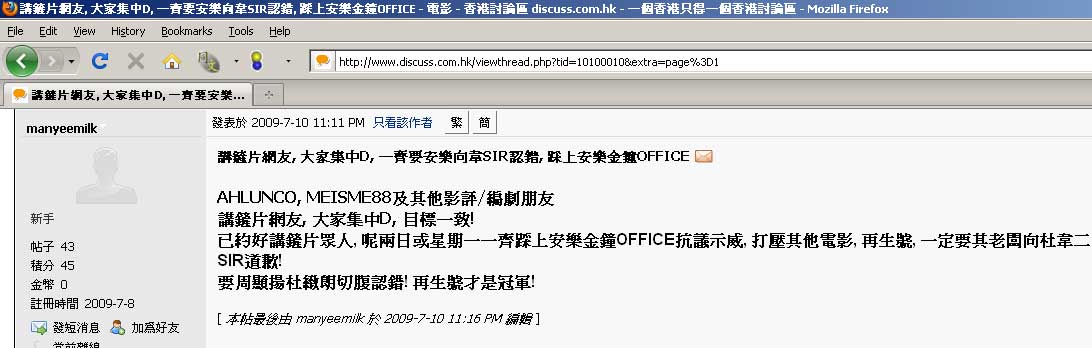(三)香港討論區用戶manyeemilk於二零零九年七月十日晚上十一時十一分發表的「前述文章」,並不代表「講。鏟。片」網誌立場,也不是「講。鏟。片」立場。所提及「講鏟片眾人」之任何表述,屬錯誤及虛假陳述。「講。鏟。片」網誌及其運作相關人士從沒參與。