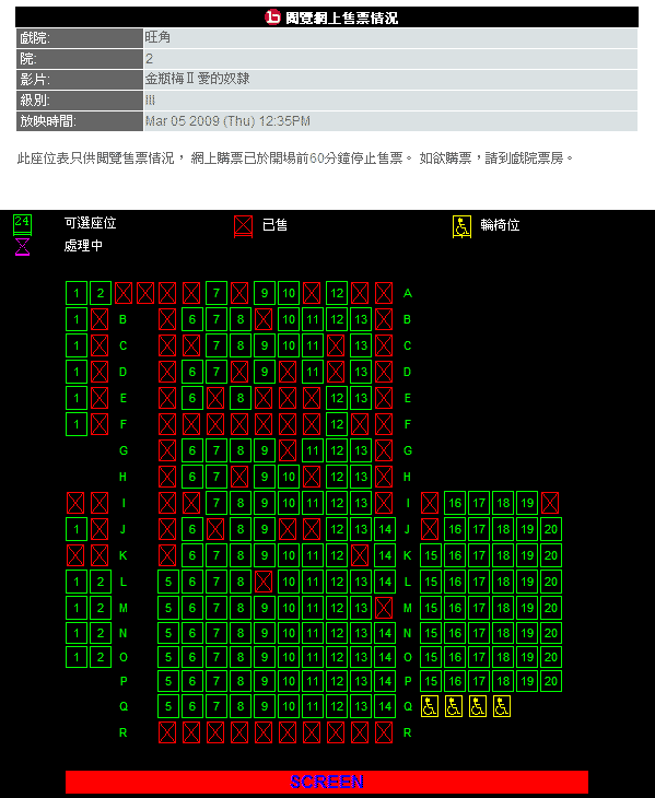 上圖所見,便是電影《金瓶梅II愛的奴隸》於開畫日在旺角百老匯二院十二時三十五分場次的售票情況,減去R行不開售的戲票後,該場售出戲票六十六張,入座率約為四份之一。不過售出的六十六票中,明顯的單人不連位戲票便佔去其中的三十八票,反映了至少逾半觀看此場《金瓶梅II愛的奴隸》的觀眾是各人購票入場。