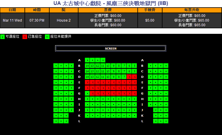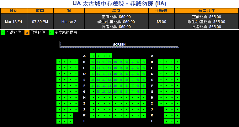 看看售票情況,便看到一些特別的地方。UA太古城中心安排選片在二院播放,可是當進入系統時,便會發現全院187個座位僅提供59個較前中間的位置提供公開售票,超過七成的座位被預留起來。