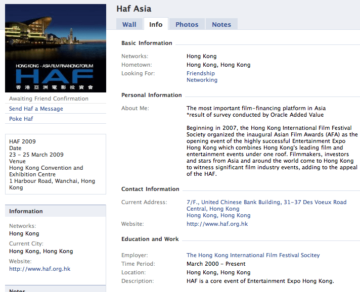 近年社交網站Facebook大盛,其重要程度不下於各位的電子郵箱,現在就連HAF也來弄了個賬戶來,可透過Facebook成為「HAF Asia好友」,「更可與一眾HAF好友交流對電影計劃的意見和感想」。在其賬戶內,提供了零八年HAF活動的相片及來年HAF的簡單資料,不過暫見不到有甚麼交流。