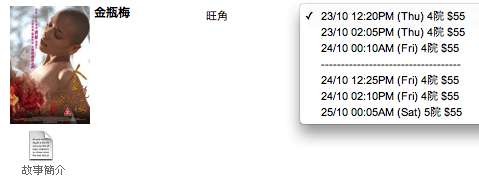 上圖所見,便是旺角百老匯戲院預告星期四及星期五戲票情況,《金瓶梅》雖然已進入第六周,但旺角百老匯仍安排放映,放映場次更由上周的兩場增至三場,也由上周全在只有五十多位的五院播放改為安排部份場次放七十位的四院播放。