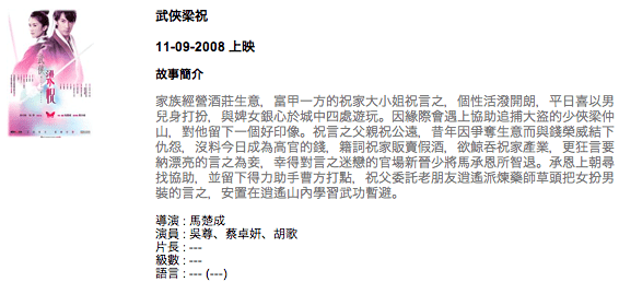 由馬楚成執導、蔡卓妍及吳尊主演的《武俠梁祝》,原預定於九月十一日中秋檔期開畫,而各戲院亦已張貼該片海報,各院線訂票網站亦有預告欄有其電影的資料。而紅磡海底隧道九龍入口亦有大型廣告,更以「9月情訂中秋」作賣點。