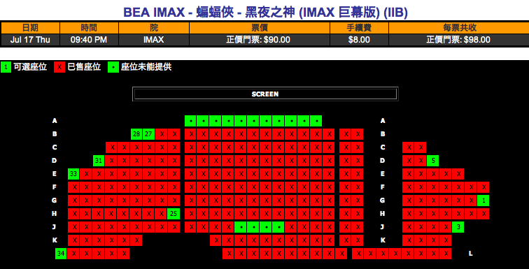 《蝙》片部份採用了IMAX拍攝,而UA Megabox的IMAX影院則會播放該片的巨幕版本。因片長關係,每天連同早場最多只能播放五場。而從放映時間表所見,星期四、六、日均出現「包場」而不公開售票的情況。結果,能公開發售的門票便出現搶購的現象。