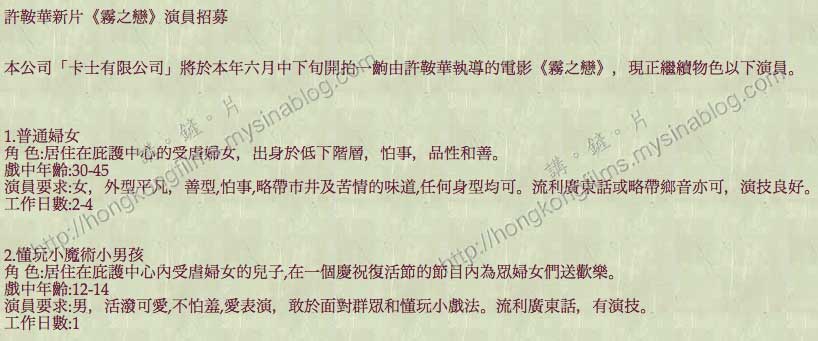 雖然許鞍華執導的高清製作《天水圍的日與夜》仍未有公映的跡象,不過她卻不愁工作,因為她執導的新片《霧之戀》將於六月底開拍,並於日前在一網站招募演員。