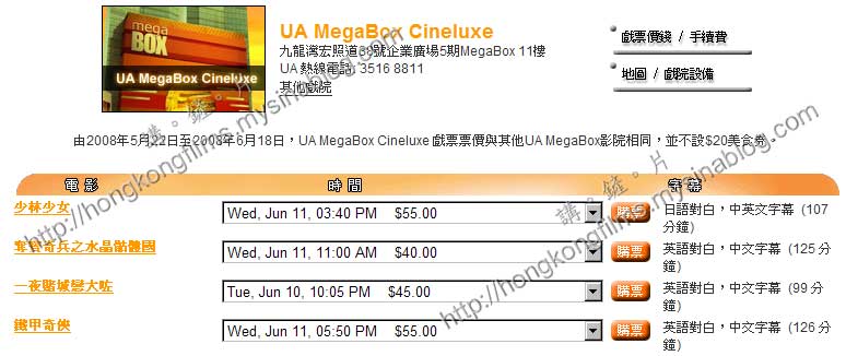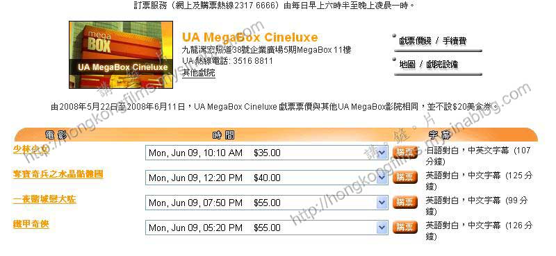 上圖所見,便是特派員早兩周於購票通網站所見,附註寫著「由2008年5月22日至2008年6月11日,UA MegaBox Cineluxe 戲票票價與其他UA MegaBox影院相同,並不設$20美食券。」