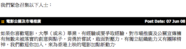 一向以來,香港電影行業的透明度並不算高,故此要在業界找尋工作機會不易。然而,最近卻有一家電影公關公司,卻在招聘網站刊登廣告招聘有關職位。
