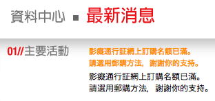 香港國際電影節的郵購訂票將於今天截止。不少觀眾今年再嘗試以網上方式訂票,卻發現了在開售數天後,「影癡通行證」出現「網上訂購名額已滿,請選用郵購方法。」的通告。