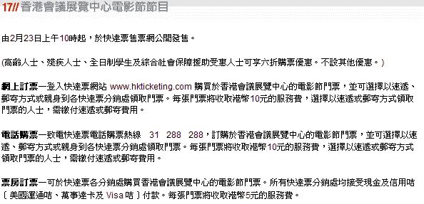 倘若閣下要訂的是會展的場次,「恭喜」你了,因為該等場次必須使用「快達票」糸統訂購。然而,「快達票」訂購方式分為網上、電話及票房訂票三種方法。網上訂票及電話訂票的服務費高達每票十元正。即使親身都票房購票,仍要收取五元服務費。