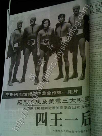 《四王一后》是七四年的電影,當年邵氏有大量與意大利合作的作品,當中還有《七金屍》等。留意英文片名是「Supermen against the Orient」,明顯地是一場大戰。看到真人的黑白圖片時,似乎有點奇怪,可是當中三男要戴著頭套?難度是在玩SM?