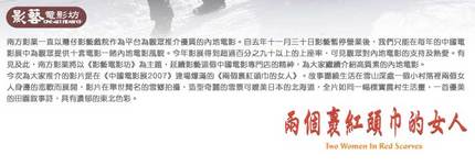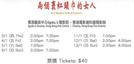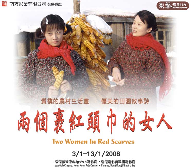 首部「影藝電影坊」選映的《兩個裏紅頭巾的女人》曾於數周前中國電影節播過,現將於一月三日至一月十三日,分別於藝術中心Agnes b戲院及香港電影資料館播放,票價四十元。對內地電影有興趣的朋友可以留意一下。