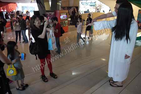 《貞子3D》在日本有大型巡遊,但香港畢竟並不可行。香港宣傳於是選擇安排這位真人扮演的貞子於上周末現身MCL德福戲院。