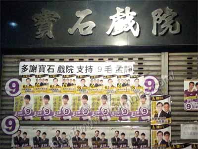 不過,更為特別的是,在戲院門口寫上「多謝寶石戲院支持毛孟靜」的字眼,並且在門外張貼了大量毛孟靜相關的宣傳海報及參選編號九號的貼紙。