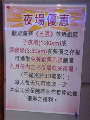 其實說穿了,就是一部「買五送一」的優惠,以五張子夜場或深夜場的戲票,來換取一張有關場次的免費戲票。不過,試圖大家又可曾到過華懋觀賞該院的子夜場甚至是深夜場?要一個月內看五部電影才能獲得一張免費戲票,看來已經不易。當中加入「每人天只可換取一次」的條款,看來也不易換取超過一次吧!